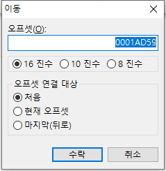 ctrl + g를 눌러서 찾기 창을 띄우고, 0001AD59 이 값을 입력하고 위치를 찾아내요.